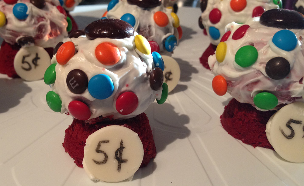 This one was by far the most time consuming. It started as a cupcake. The animal crackers were spray painted with food coloring, the center shaft is a pretzel rod dipped in dark chocolate. The crackers are attached to candy canes. Each one took WAY too long to make and was difficult to hold together but it came out great. These are meringue mushrooms. The are made in 2 sections - the heads and the stems. Dark chocolate holds them together and they are sprinkled with cocoa powder. Some gumball machines - these were also pretty time consuming. These hot dogs are Twinkies cut in 1/2 with rolled up brownies in the middle. Some scuba divers. These chicken nuggets are actually brownies with icing coated in Frosted Flakes and were brought to one of the class morining get togethers at school and almost nobody ate them because they thought they were real Chicken McNuggets |